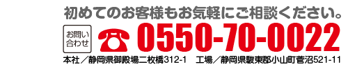 静岡県御殿場市二枚橋312番地の1 TEL0550-70-0022 FAX0550-70-0246 工場 静岡県駿東郡小山町菅沼521番地の11 TEL0550-76-3333 FAX0550-76-5394 |